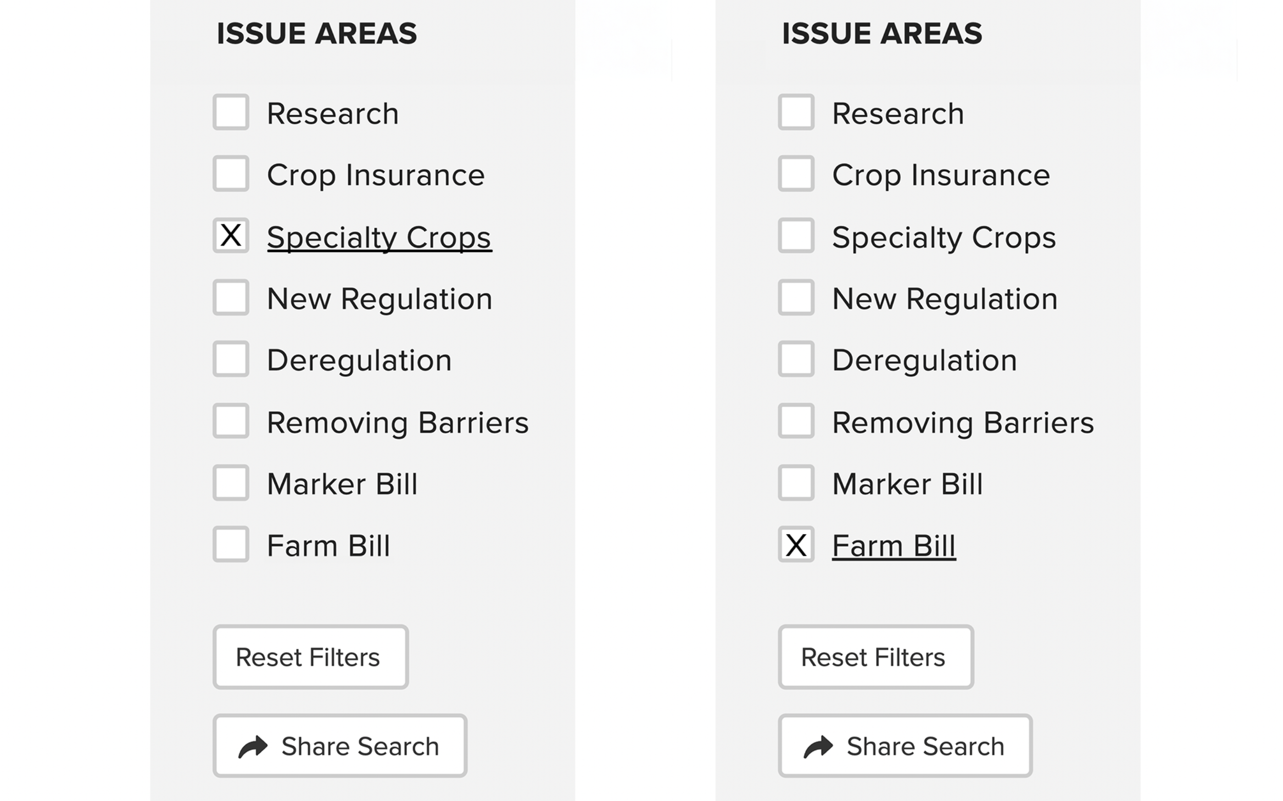 As always, you can sort bills by various issue areas, but now you can also sort bills by “Farm Bill” for a quick way to scan for bills included in the Farm Bill. Additionally, we have added “Specialty Crops,” given the increase in related legislation in recent months.