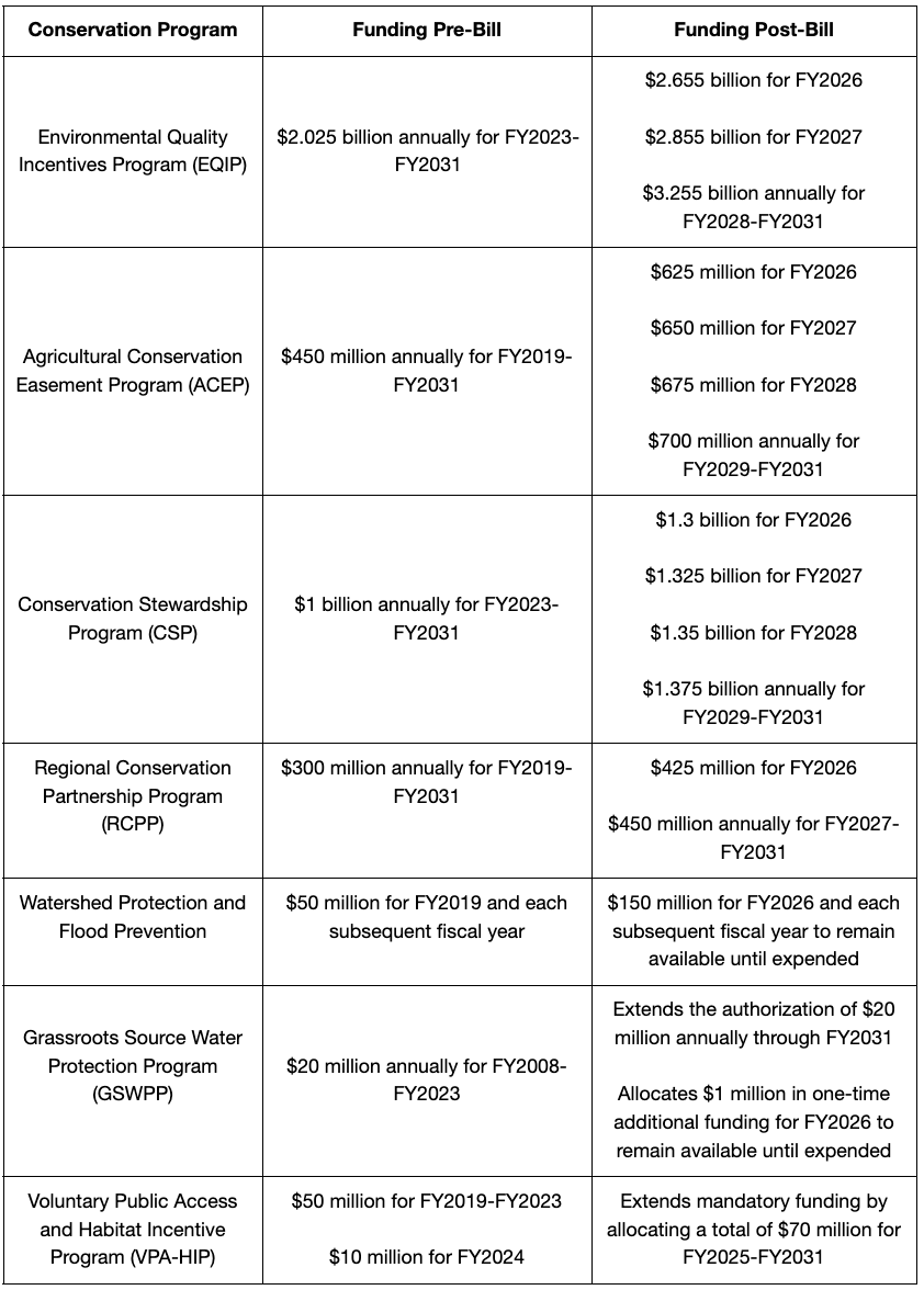 The OBBBA both funds the major NRCS conservation programs, detailed in the table below, while rescinding the unobligated balances of the amounts appropriated for those same programs by the Inflation Reduction Act (IRA) - the reconciliation bill passed under the previous presidential administration.
