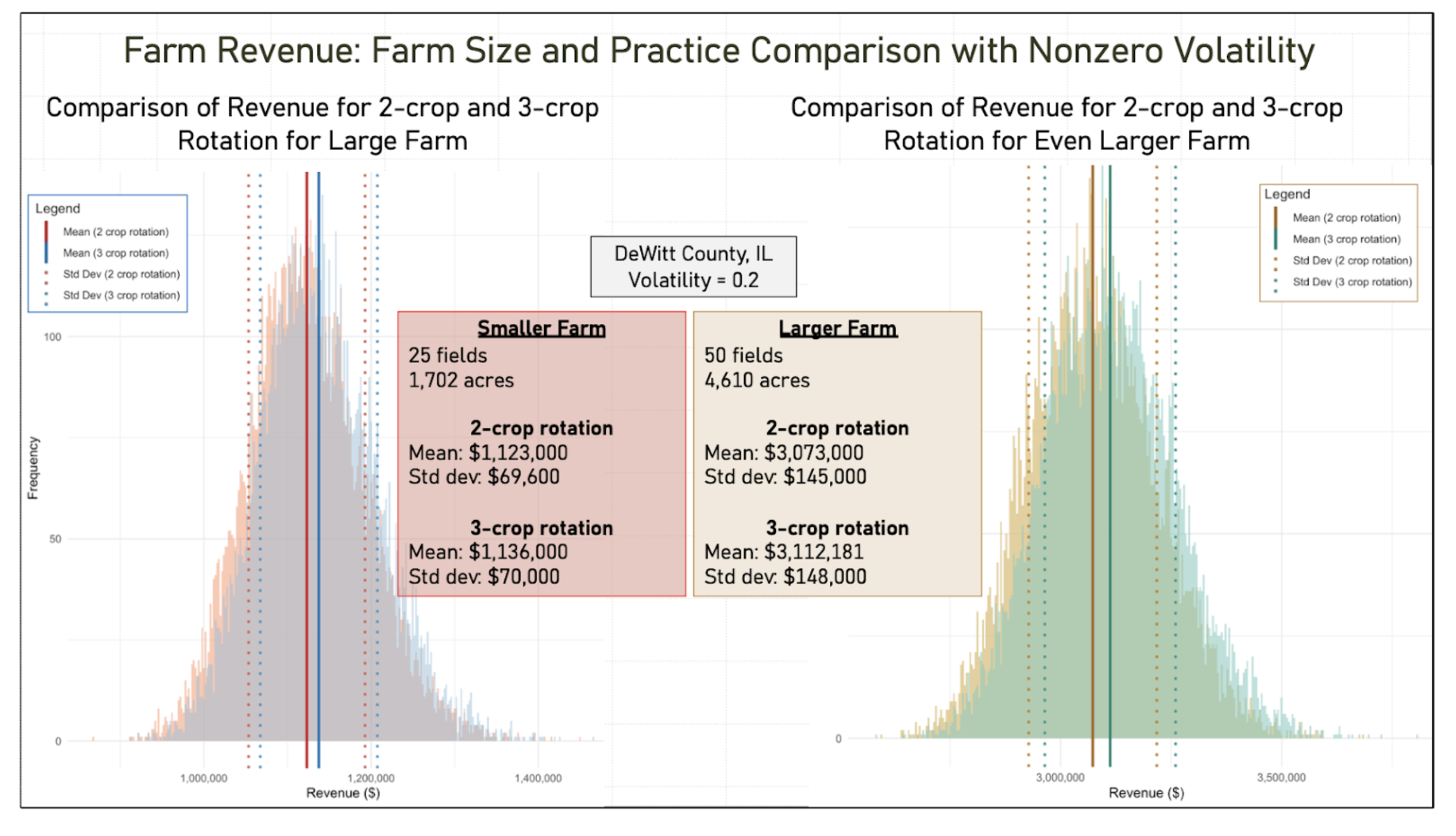 Figure #2: Comparison of Revenue for 2-Crop + 3-Crop Rotations for a Large Farm vs. Even Larger Farm With Nonzero Volatility. A critical takeaway for the farming community and its financial partners is the comparison between different scales of farm operations. In the above figure, while a Medium-Large Farm (just under 2000 acres spread across 25 fields) demonstrates significant stabilization of its revenue, with mean around $1 million, compared to individual fields where the uncertainty level per acre would be 4-5x higher, the Very Large Farm (on the right hand side of the figure, with nearly 5000 acres spread across 50 fields) scales these efficiencies to a total revenue mean of over $3 million, with an uncertainty level per acre around 8-10x higher at the field level.