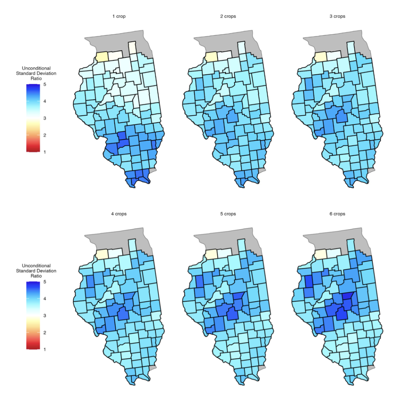 Figure #3 (above): Maps of Unconditional Standard Deviation Ratios for Model 2 (With Price Yield Correlation). These maps illustrate the "risk multiplier" across Illinois, showing that when price uncertainty is introduced, overall revenue risk typically increases by a factor of three to four compared to yield risk alone. Interestingly, this ratio is highest in the most productive regions of Central Illinois. Because these areas have the lowest yield uncertainty, price volatility becomes the overwhelming driver of their remaining financial risk. By accounting for the unique, often negative, price-yield correlations in each county, this model provides a more nuanced spatial "signature" of risk than simpler independent models, confirming that while soil-health practices stabilize yields, they must be understood within the dominant context of global market volatility.