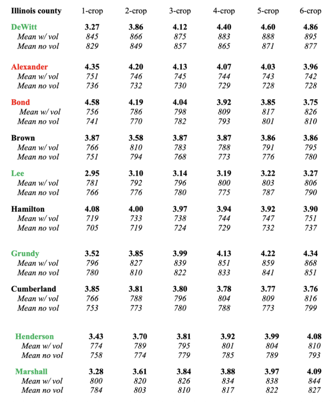 Table #1: Yield-Price Uncertainty Standard Deviation Ratios (Unconditional, County-Level Aggregate) for 10 Selected Illinois Counties, per Number of Crops in Rotation, With County-Mean Dollars per Acre in Each Case. This table is for the realistic model (price-yield correlation included). The green color in the county names indicates the counties where the ratio increases with the number of crops in rotation, the black color indicates those counties where that ratio is largely constant across crop rotation number, and the red color indicates the counties where the ratio decreases. The dollar-per-acre means show the slight but consistent increase in mean revenue in 9 out of 10 counties. The larger yield-price uncertainty ratios for higher rotational complexity are a translation of the stabilization of yield risk with the higher RCI, since price risk remains unchanged.