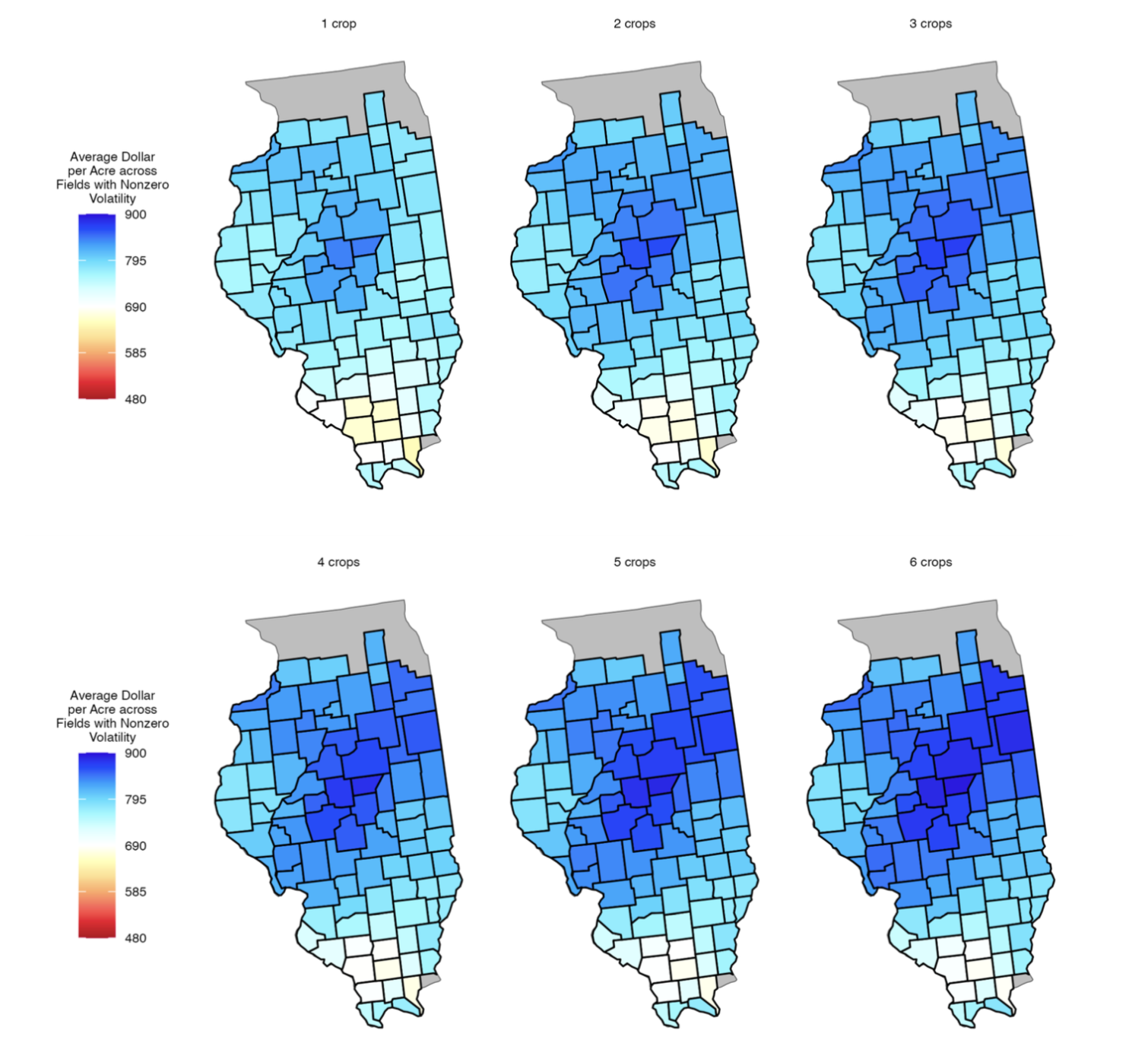 Figure #1: Maps of Average Dollar per Acre Across Fields for Model 2 (With Price-Yield Correlation) With Nonzero Volatility. These maps illustrate the posterior mean revenue for corn when accounting for both market volatility and the realistic negative correlation between price and yield. While the benefit of increasing rotational complexity (moving from one-crop to six-crop scenarios) remains evident in high-productivity regions—specifically the central, central-western, and northeastern sections—the "natural hedge" of price-yield correlation subtly smooths the revenue upside. In regions with more variable yields, such as Southern Illinois, the negative correlation provides a floor by enhancing revenue during yield downside events.